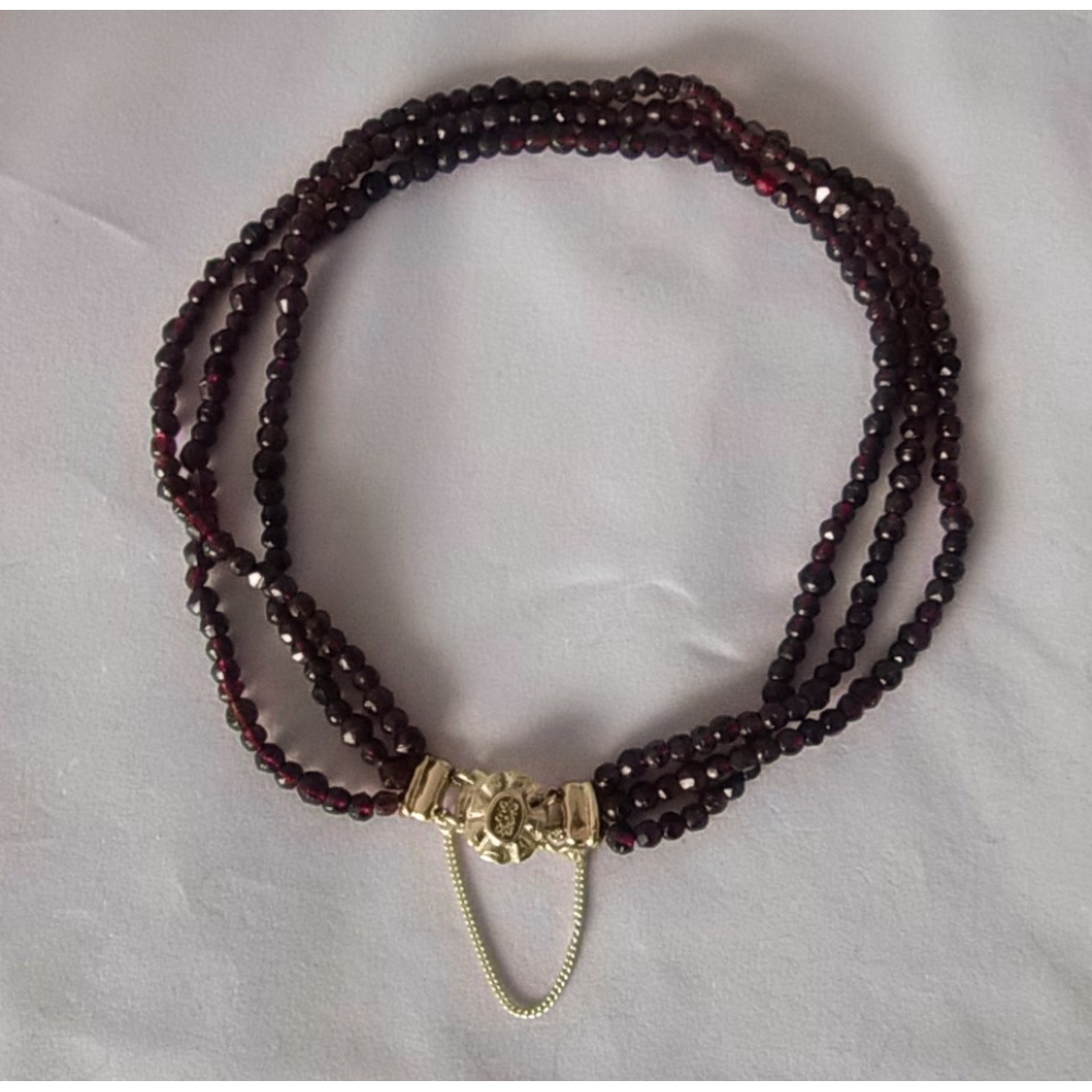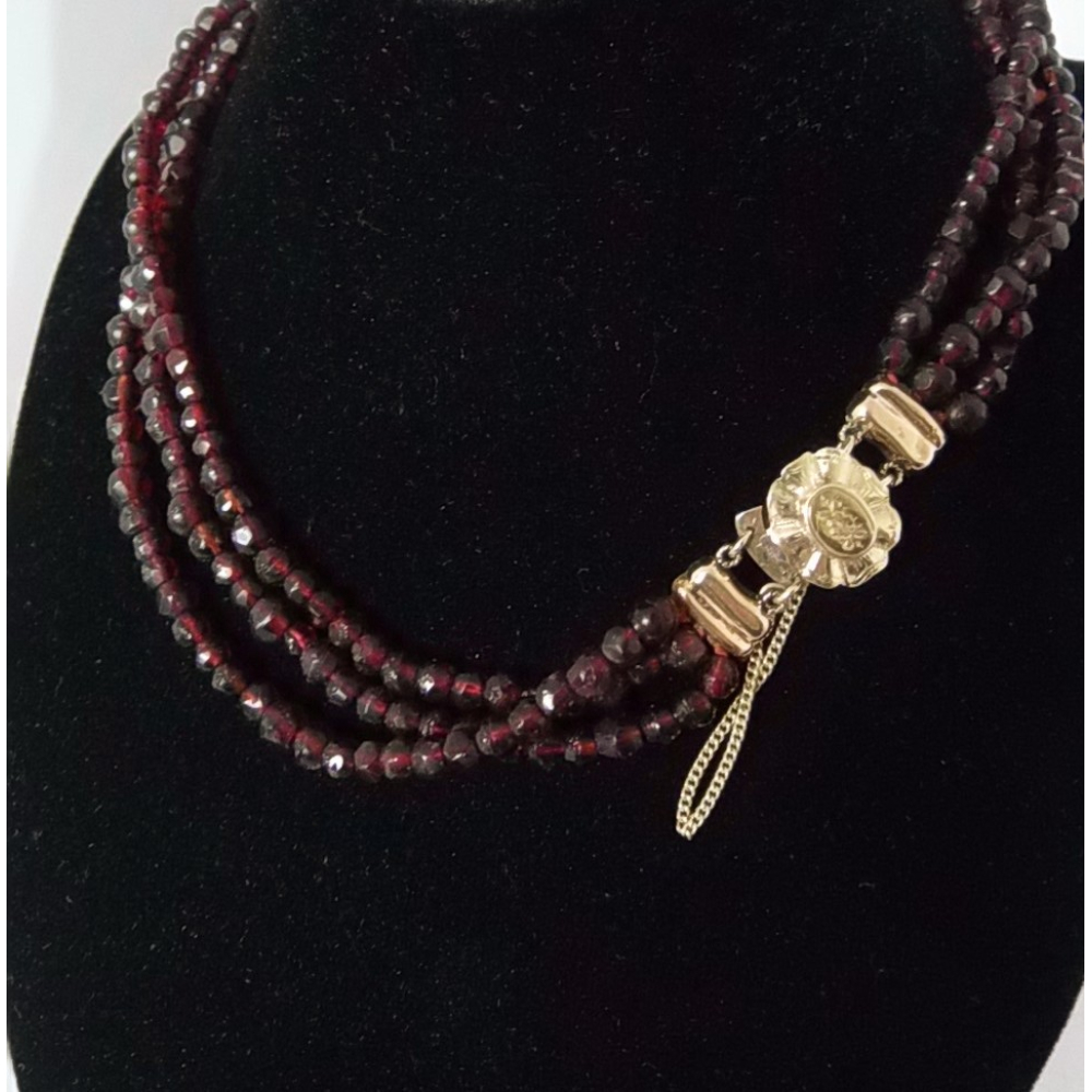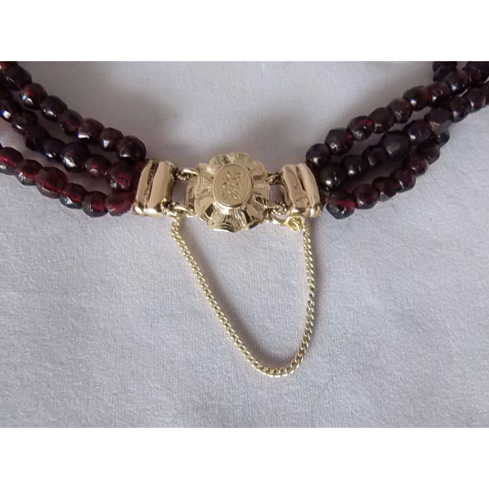 Een antiek streeksieraad met glasgranaten en 14 karaat gouden slot. De lengte van het kortste snoer is ongeveer 38cm. Het slot heeft een kleine reparatie met tin zoalsvroeger veelal gebeurde, het blijft prima zitten en heeft een extra veiligheidsketting.