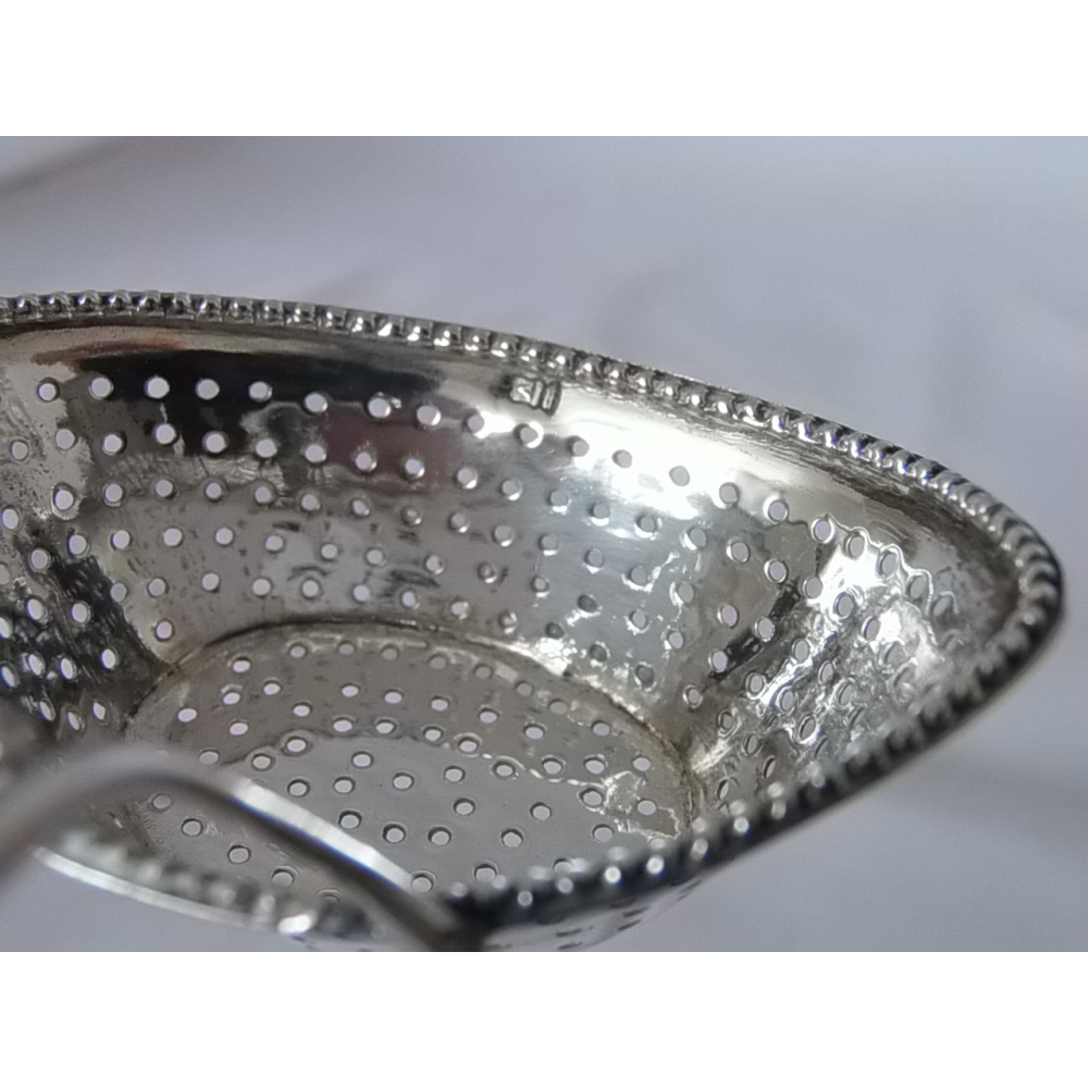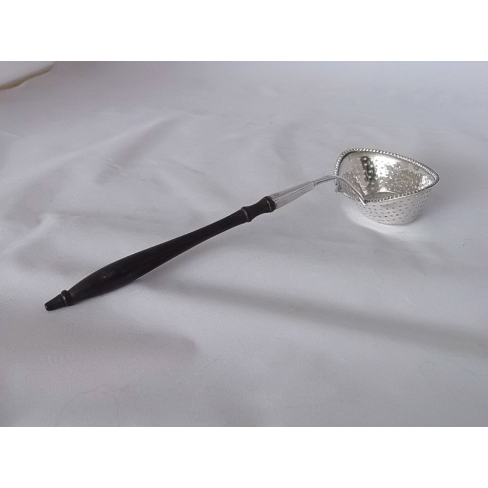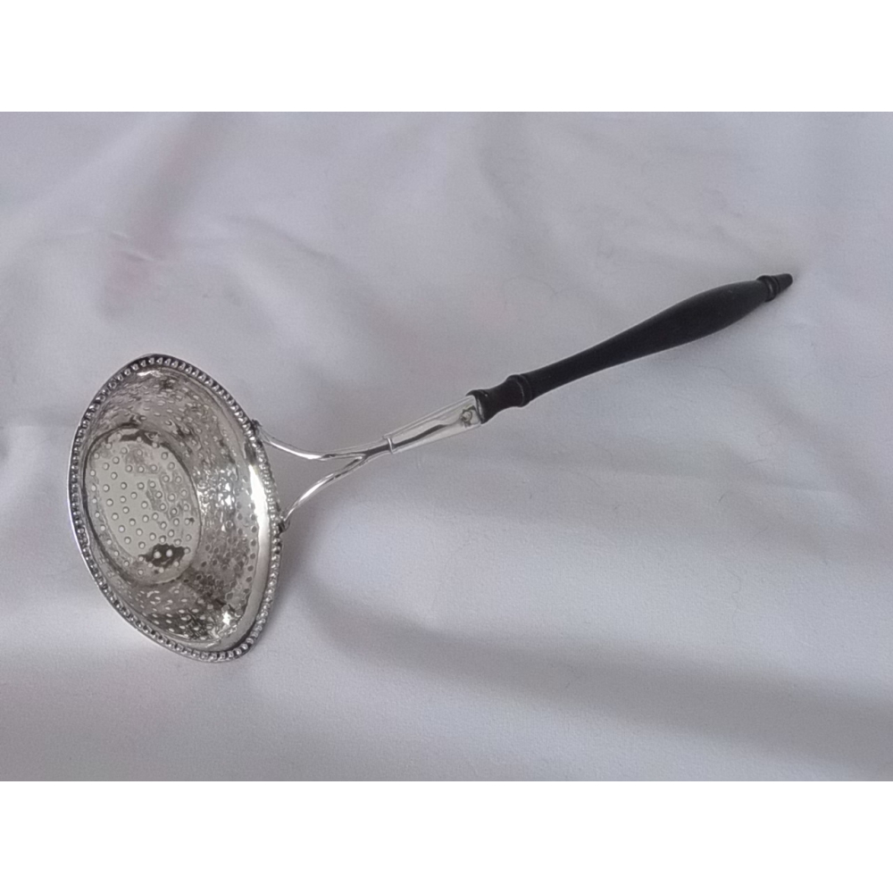 Zilveren strooilepel. Mooi te gebruiken voor poedersuiker op de oliebollen. De Bak is van zilver een een vermoedelijk ebbenhouten steel (omstreeks 1850).