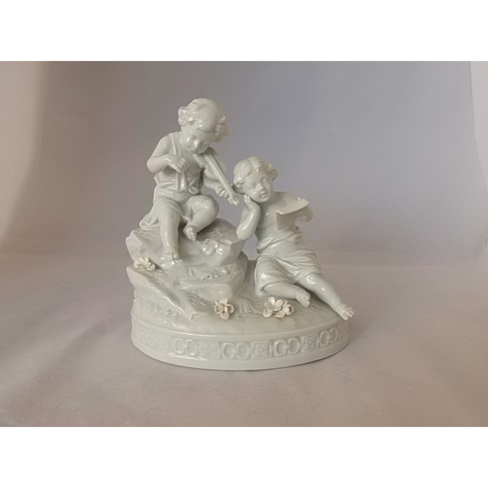 Beeld van 2 romantische figuren welke lezend en muziekmakend. Beeld is geheel gaaf en 16cm hoog en 14 breed.