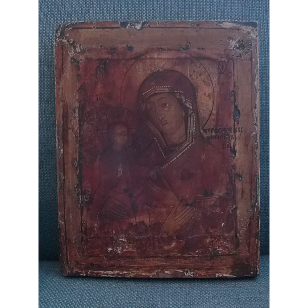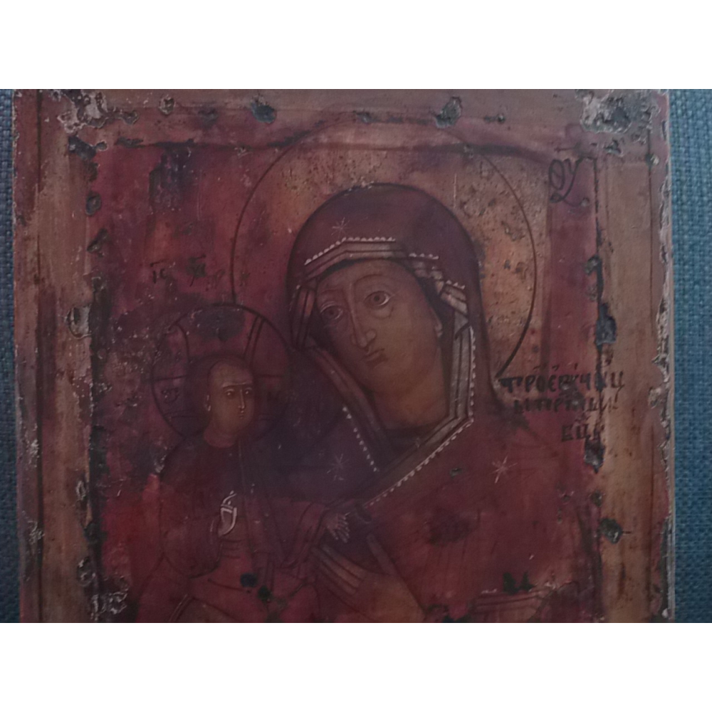 Een icoon, Rusland 19e eeuw Polychroom beschilderd hout met afbeelding van Maria Trychorusa (Maria met drie handen), 31 x 24.5 cm.