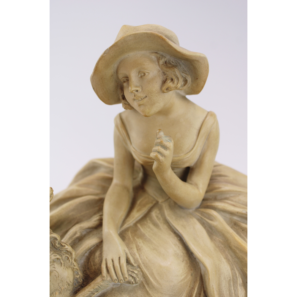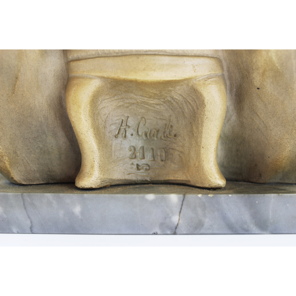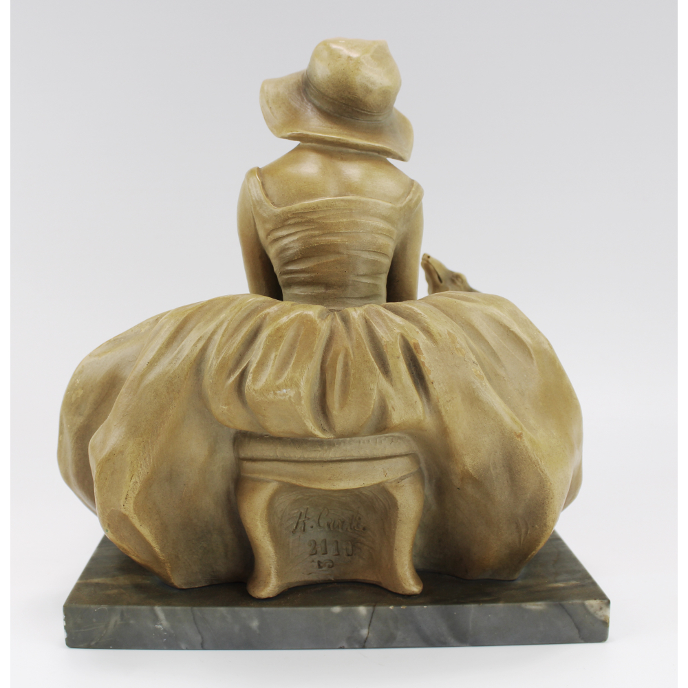 Een zittende jongedame met een wijde jurk en hoed, ze houdt de poot van haar hond vast. Gemaakt van grijsbruine terracotta (aardewerk) en gesigneerd op de achterzijde, op een marmeren plaat. Ca. 1920-30, waarschijnlijk Italië. Hoogte 26.5 cm, Breedte 24.5 cm Enkele kleine schilfers (bv langs rand van de hoed en een schoentje, zie close-up foto's) maar geen grote beschadigingen.
