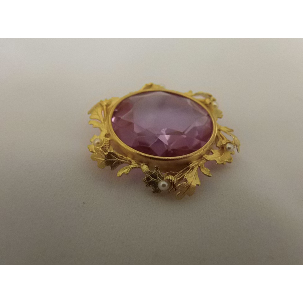 Gouden broche met Amhetist en pareltjes, 14 karaat goud.