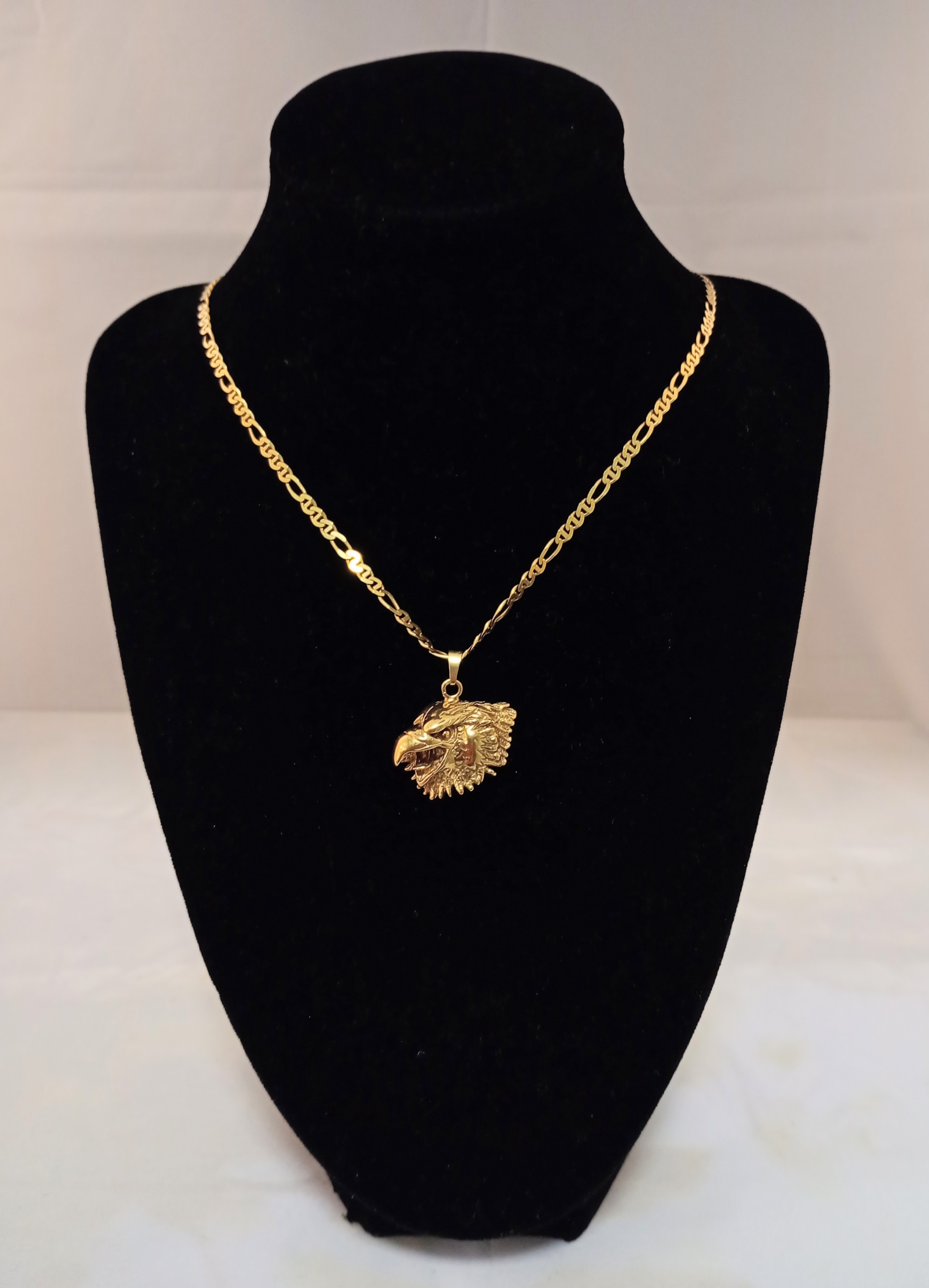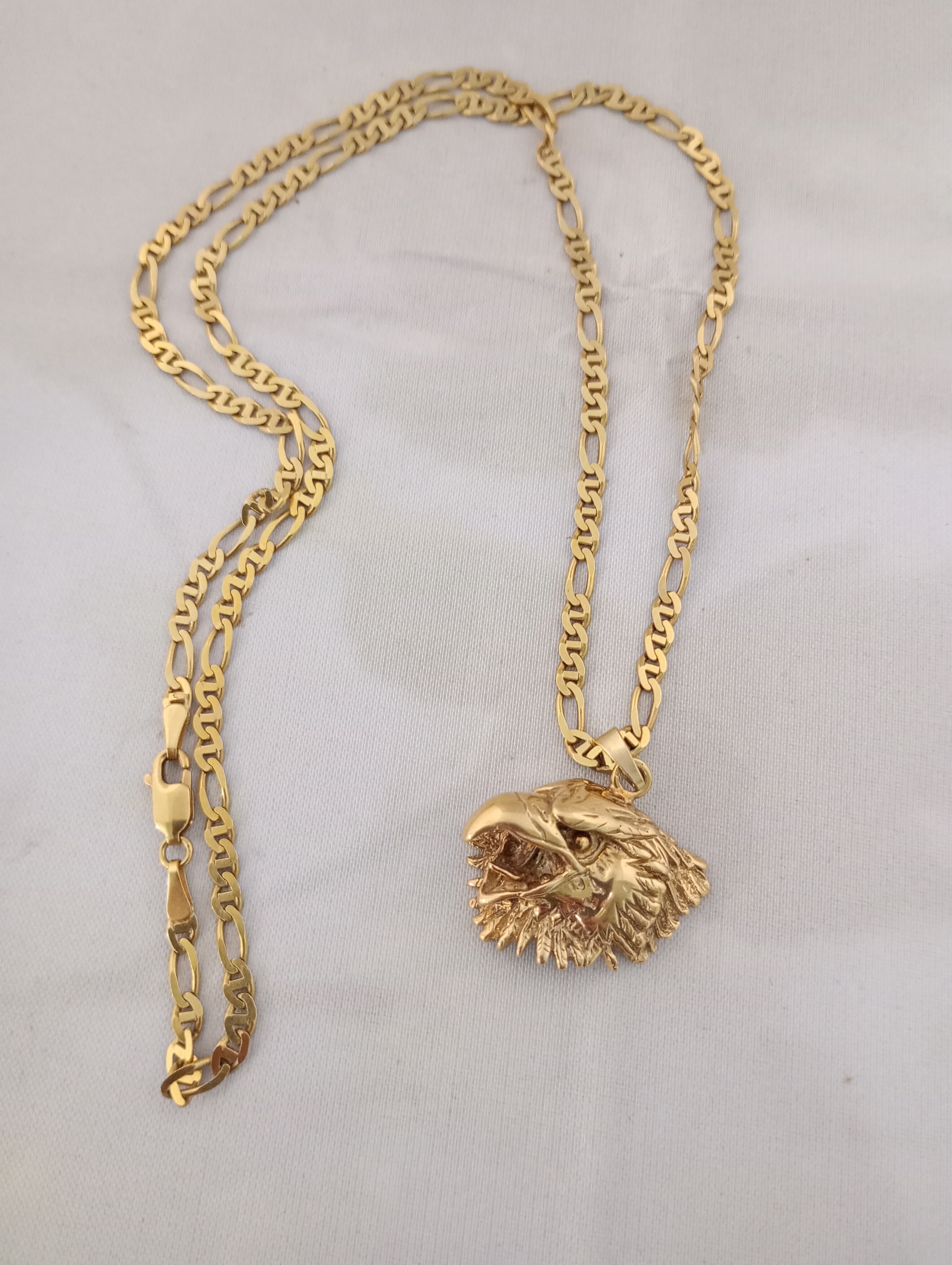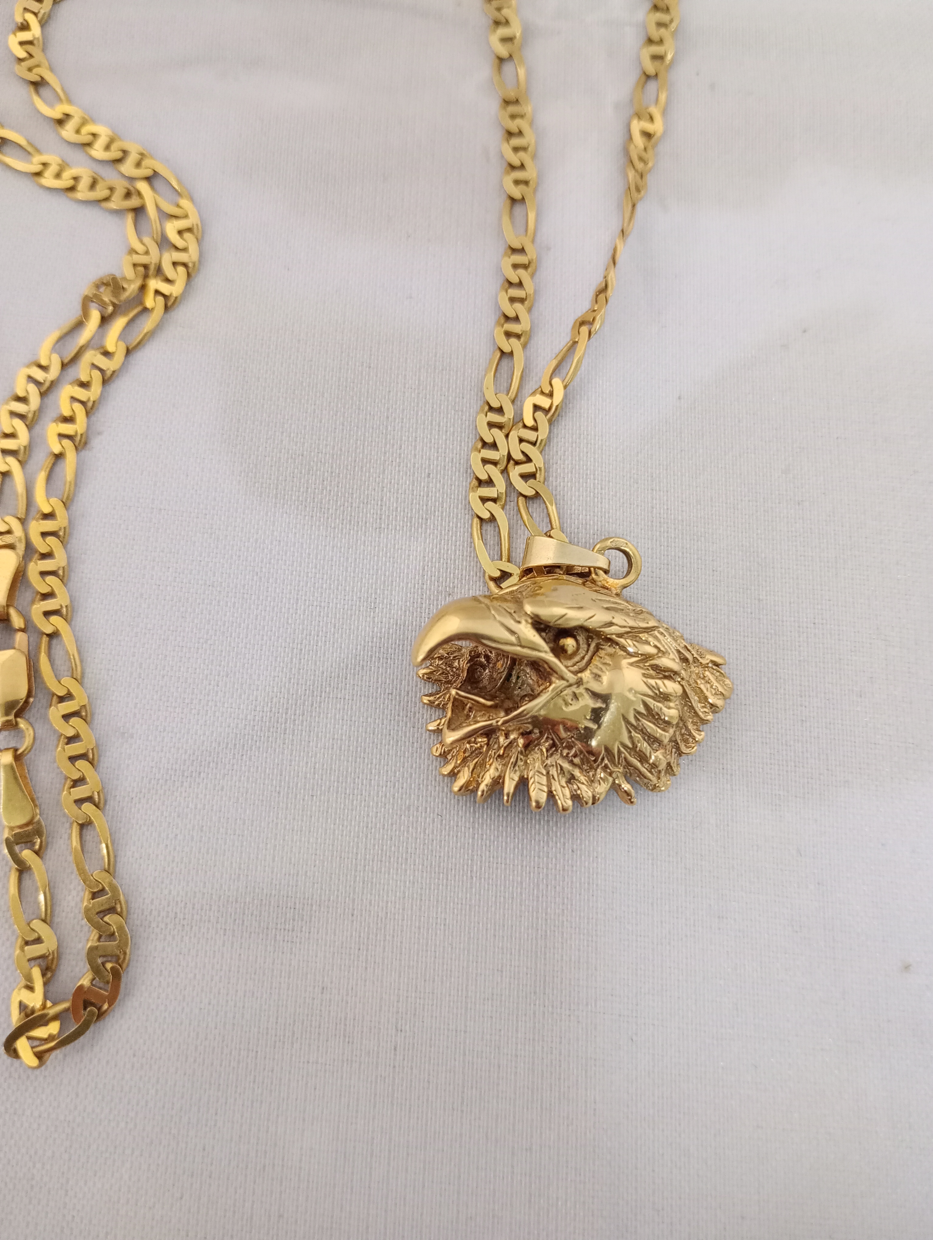Set van katting en (massieve) hanger van een adelaarskop. Het is gemaakt van 14karaat geelgoud. De ketting heeft een lengte van 50cm de adelaar meet 2,4cm bij 2,1cm. Het weegt samen 15,69gram.