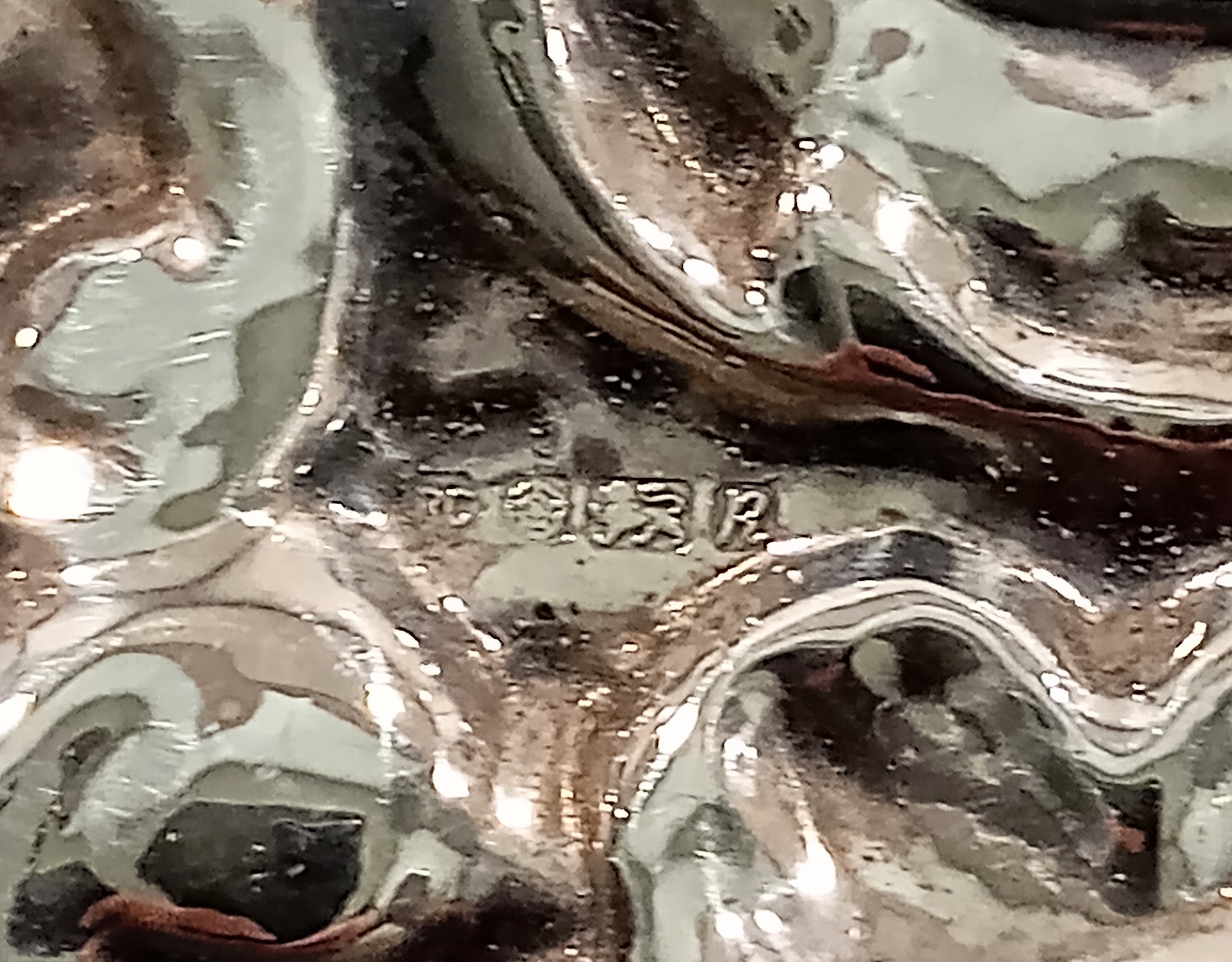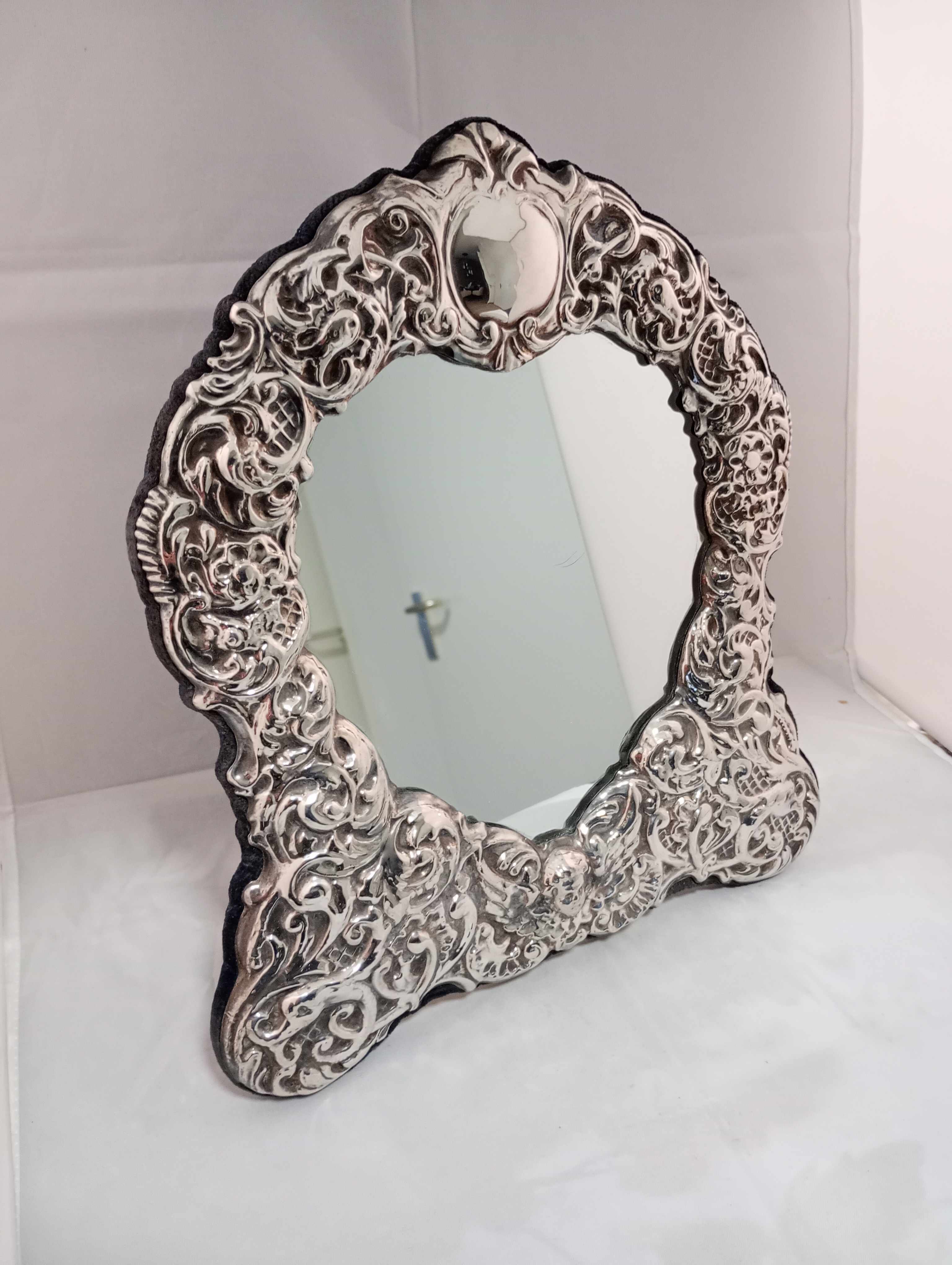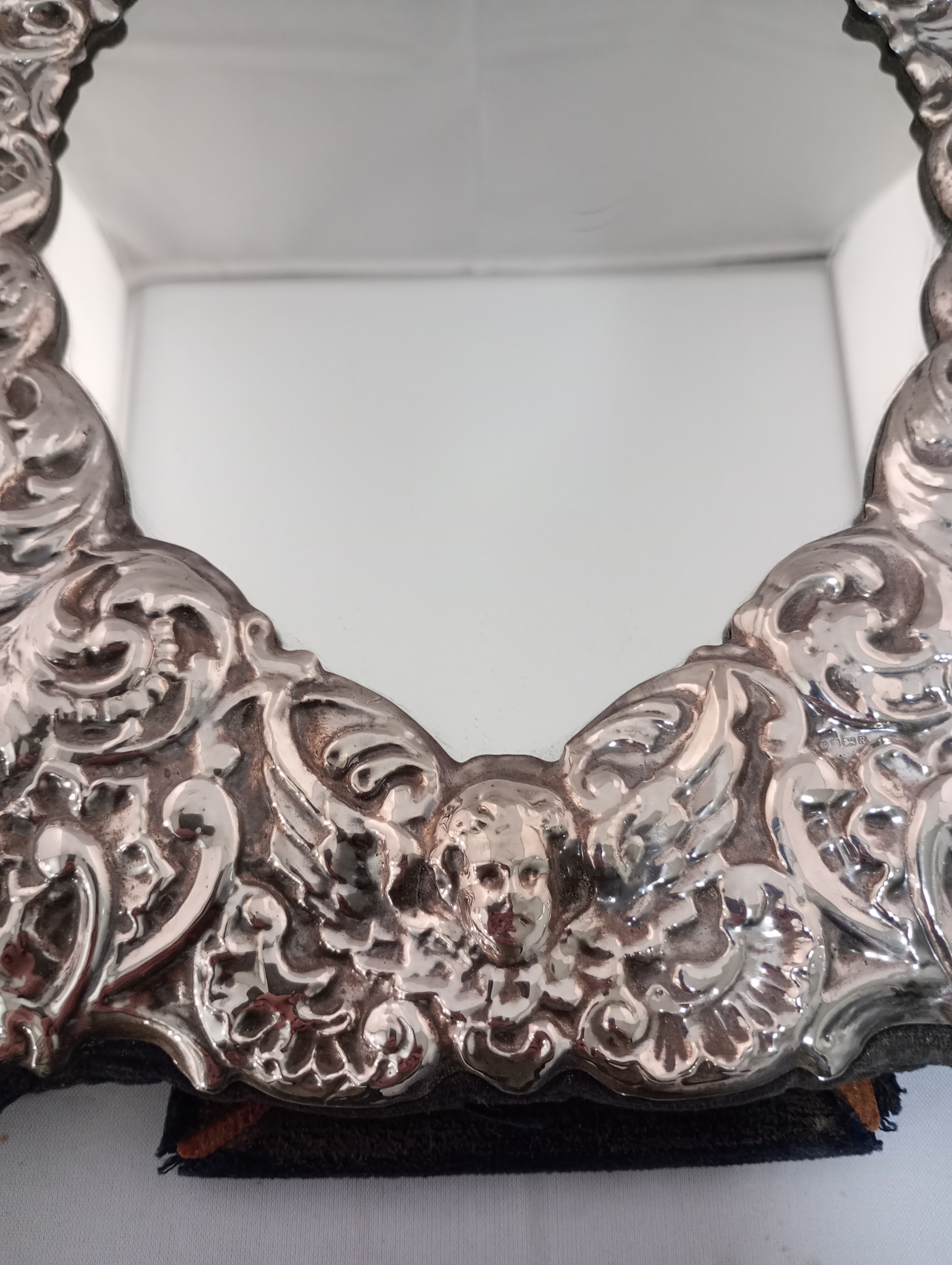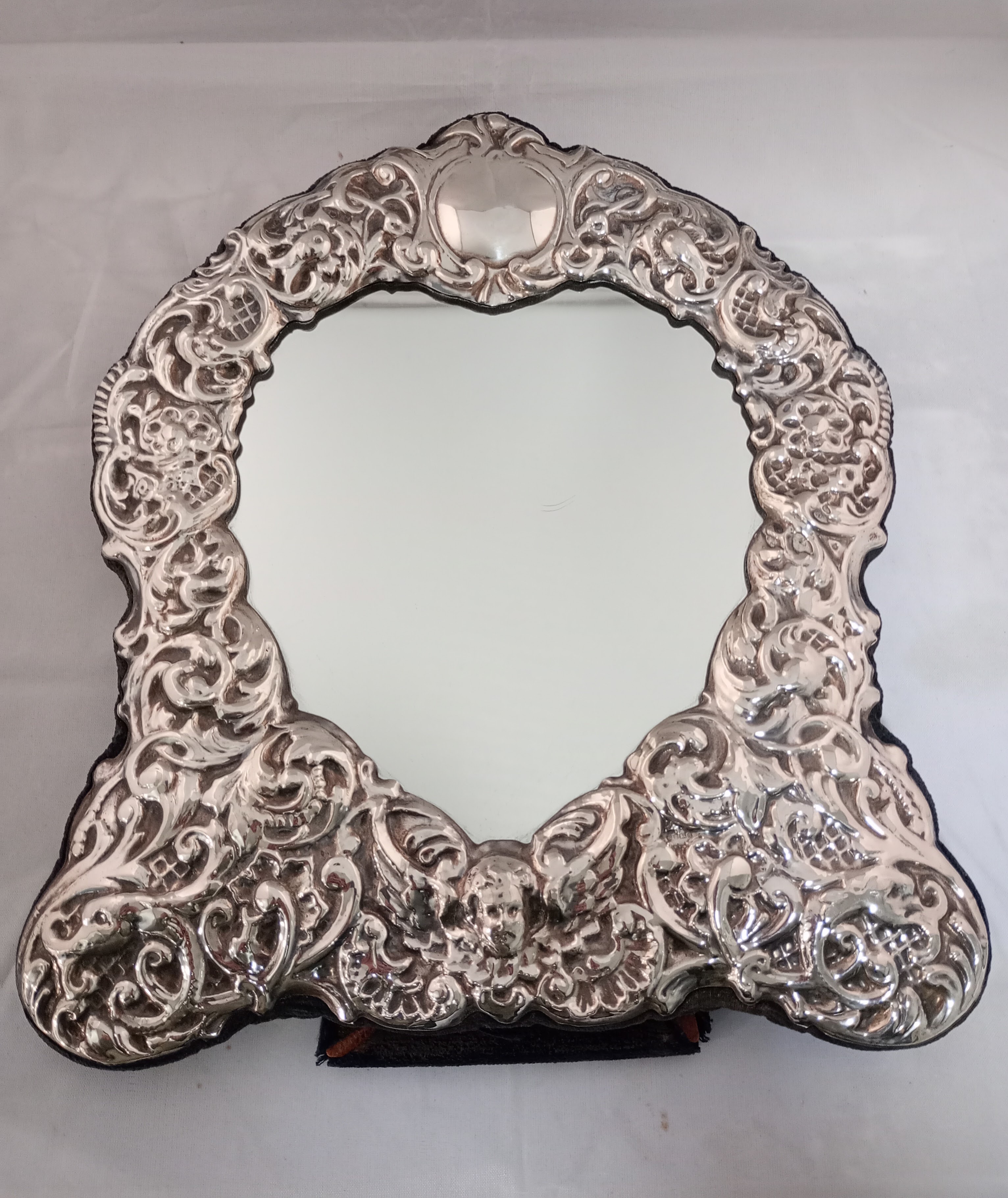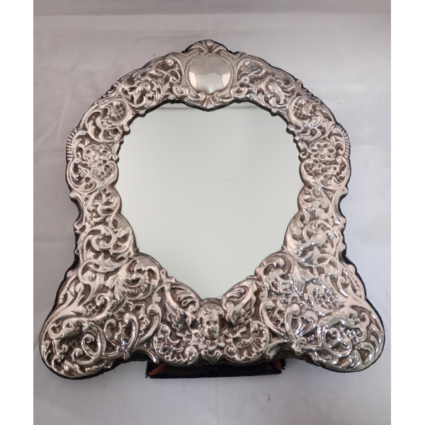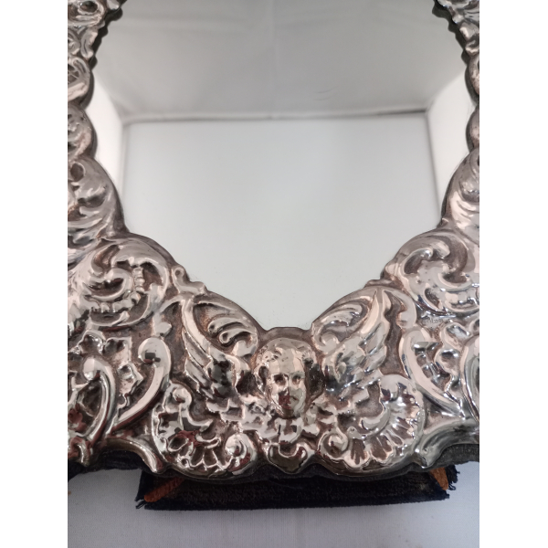 Grote antieke 1ste gehalte zilveren lijst. Het kan nu dienen als bijv. spiegel op een kaptafel, je zou de spiegel ook kunnen vervangen met glas en dan is het een prachitge grote fotolijst. Het is 28cm hoog en 24 a 25cm breed.