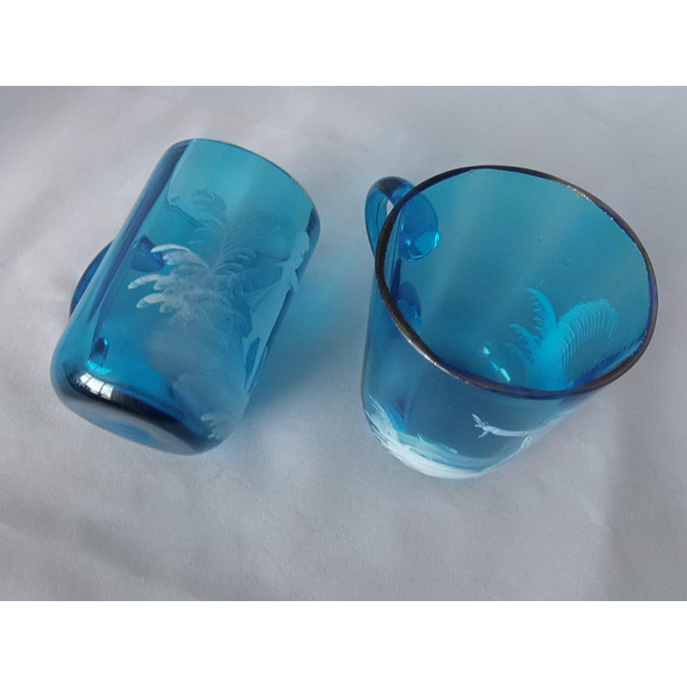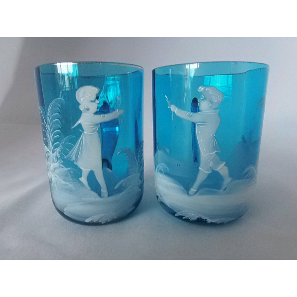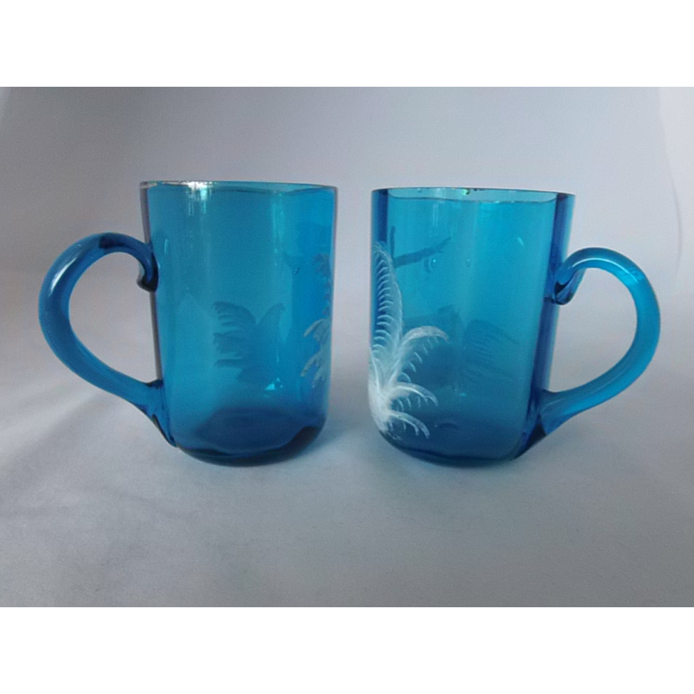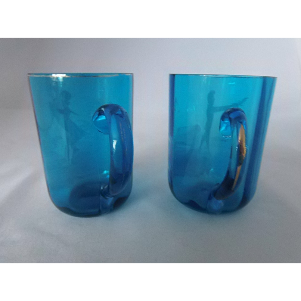 2 Glazen Mary Gregory mokken. Door de tand des tijds her en der wat sleets maar nog steeds prachtig.