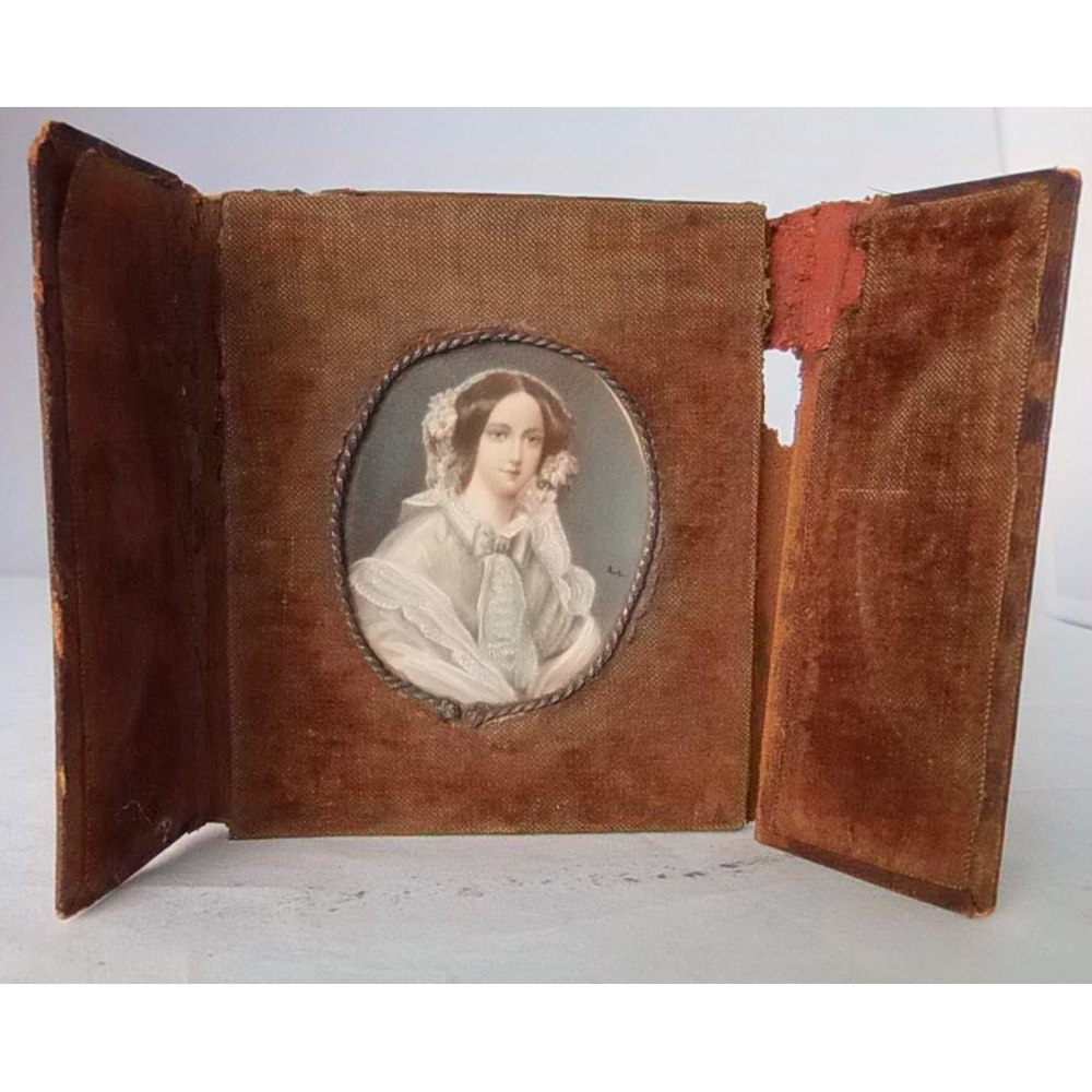 Een aquarel portretje achter glas in een kaftje. Gesloten is het kaftje 10cm bij 12cm. Het portretje is ongeveer 7cm bij 5,5cm. Het kaftje is heel fragile en heeft de tand de s tijds niet helemaal gaaf doorstaan. Ik heb het voor nu in originele staat gelaten.