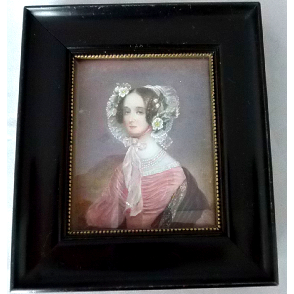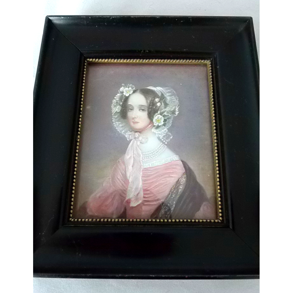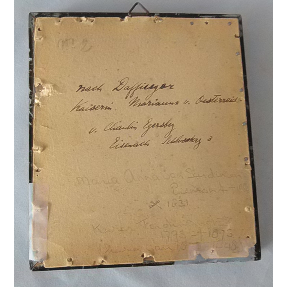 Portretminiatuur keizerin Marianne, 19e eeuw; Geschilderd op melkglas, in zwarte lijst.