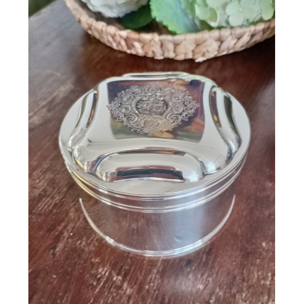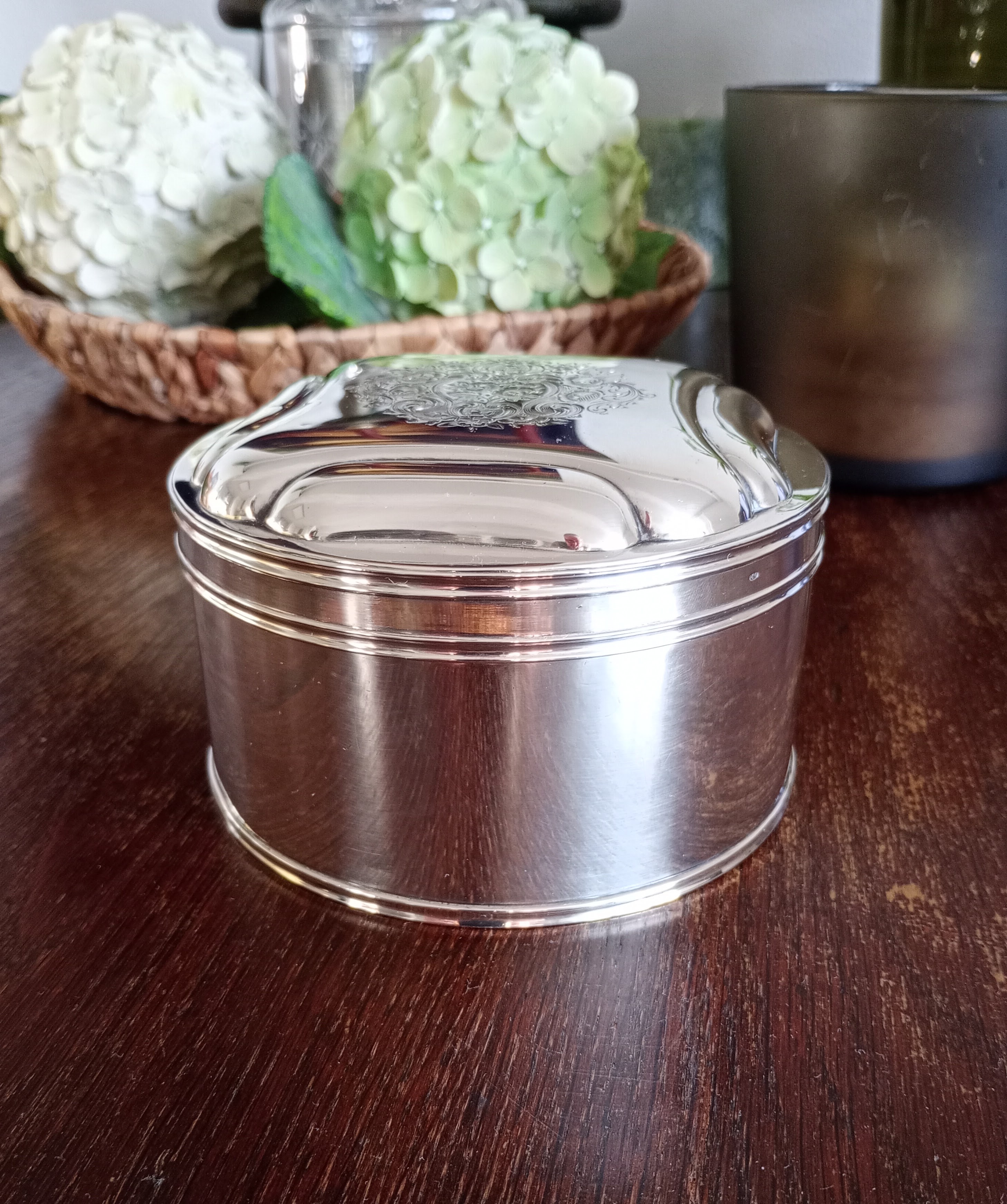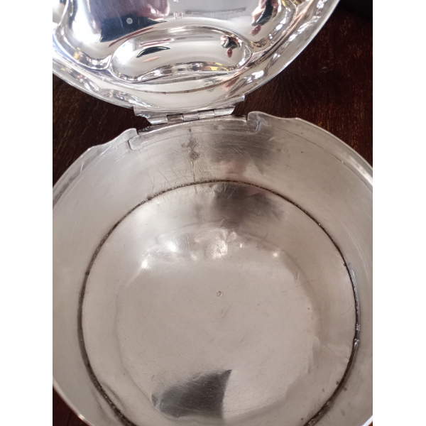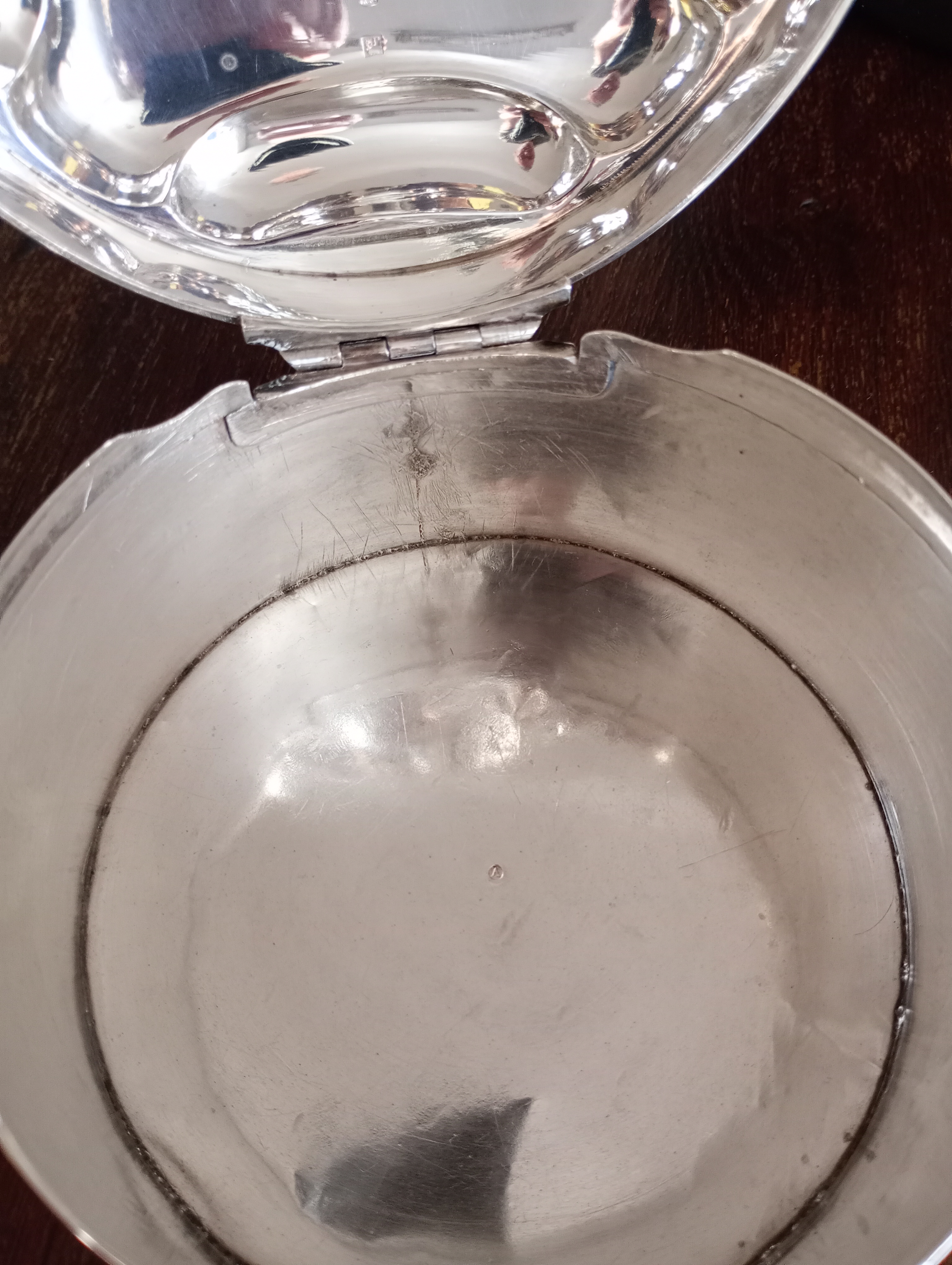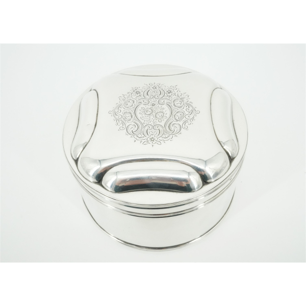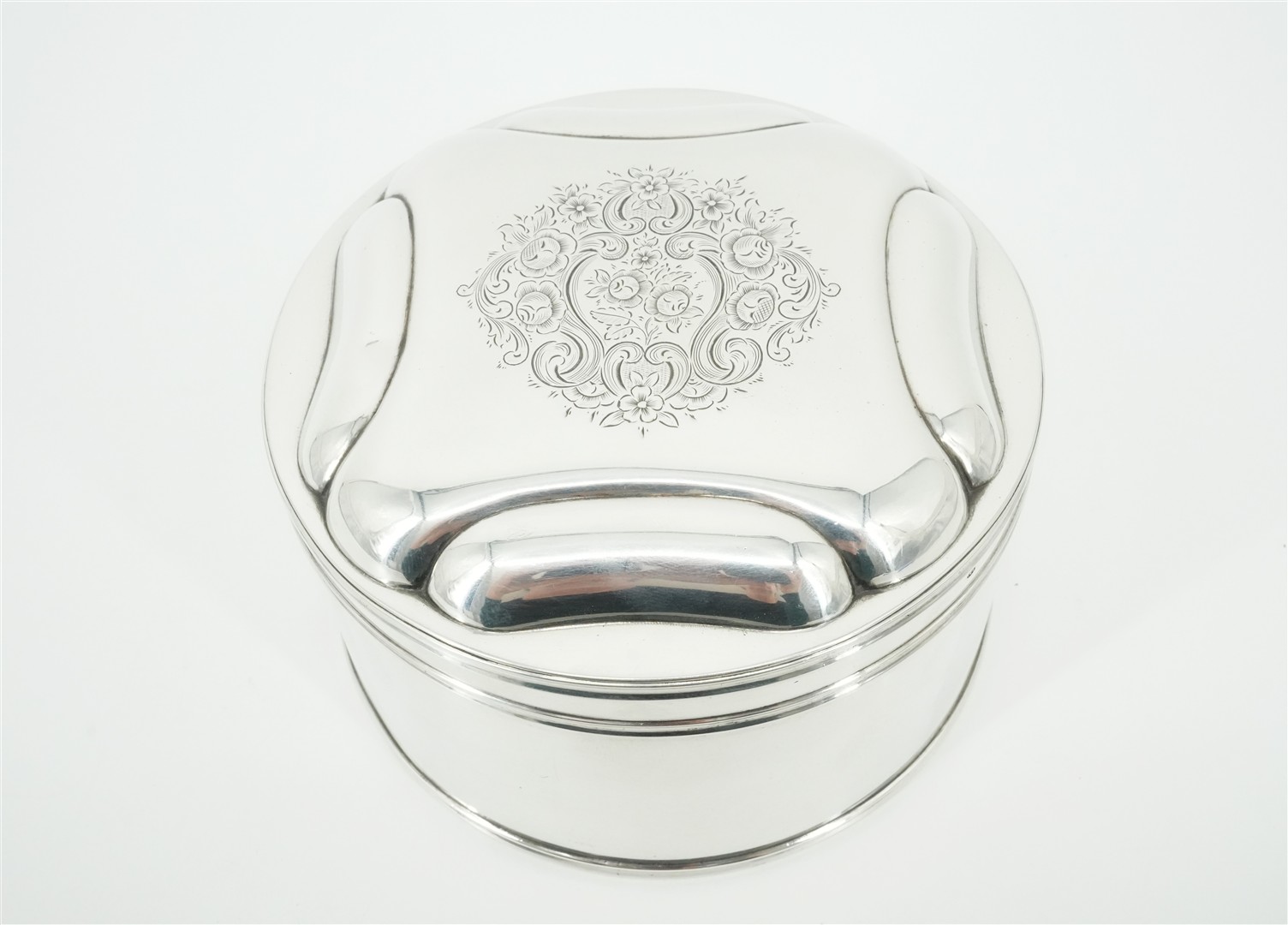 Ronde zilveren biedermeier koektrommel met opgehoogde deksel, versierd met floraal graveerwerk, anno 1855, meester: Abraham Bernard van Grasstek, Amsterdam, diameter 13 cm., gewicht 315 gram