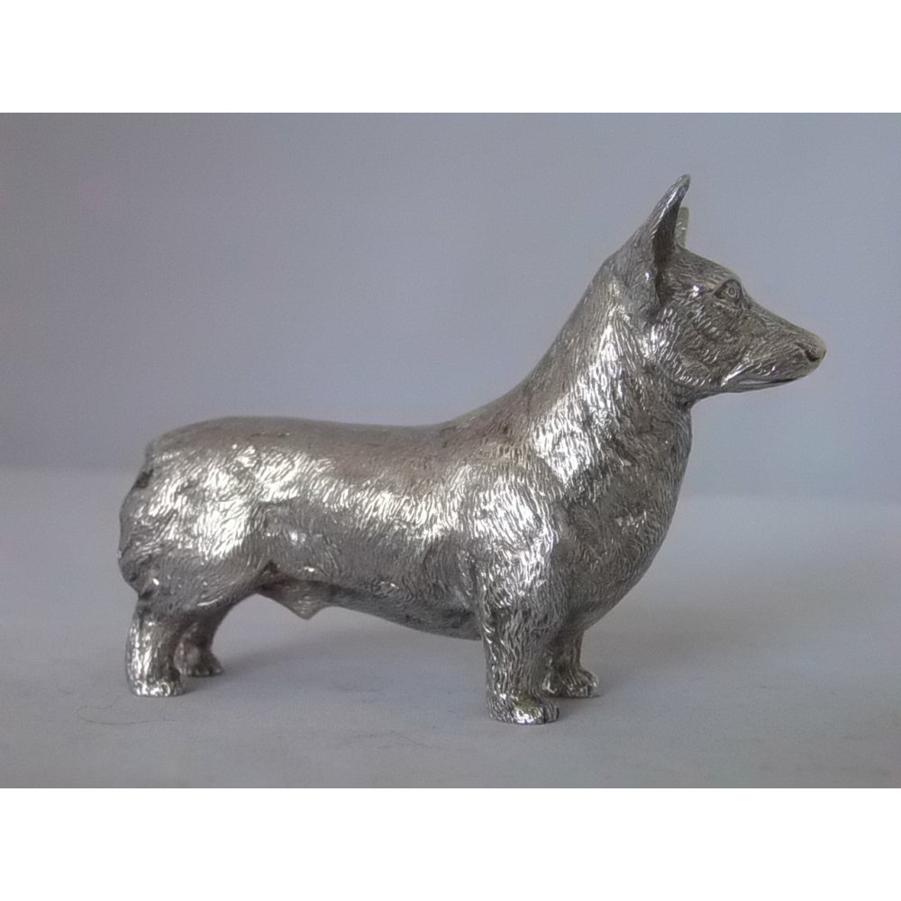 Een zilveren miniatuur van een Corgi. Het beeld is 100gram zwaar en 8,5cm lang en 6cm hoog. Mooie gedetaileerd en prachtig als cadeau.