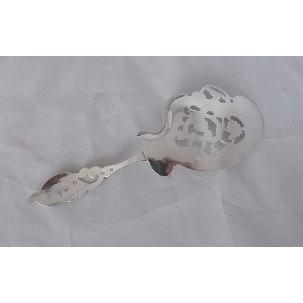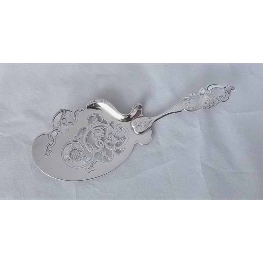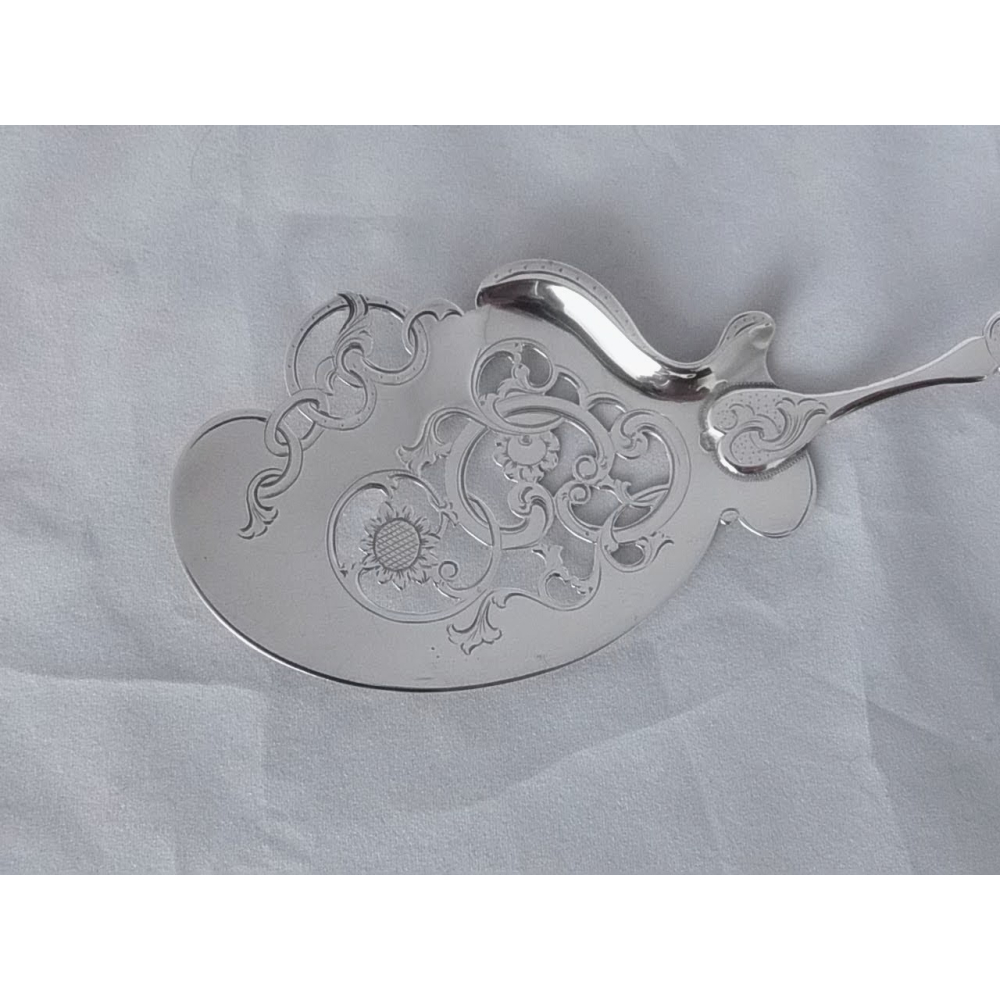 Fraai model met deels opengewerkte schep en voorzien van gegraveerde biedermeier decoratie. Nederland, Kollum, D.P. Kooi, 1864, keurtekens: leeuw, Minerva, meesterteken e. 39 gram, 835/1000. Afm. L 20,4 cm, B 7,3 cm.
