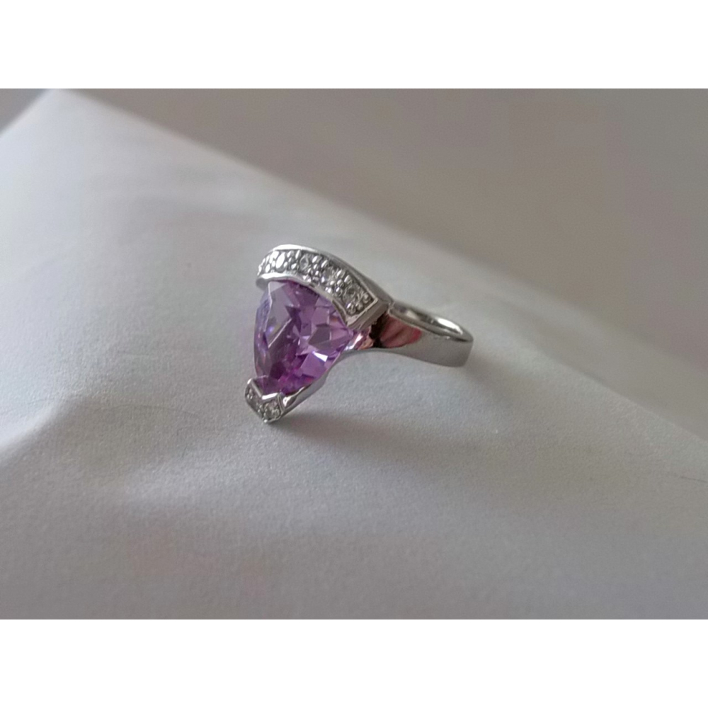 Zilveren ring van 1ste gehalte zilver en gezet met paarse steen en enkele kleinere witte steentjes, ringmaat 19cm