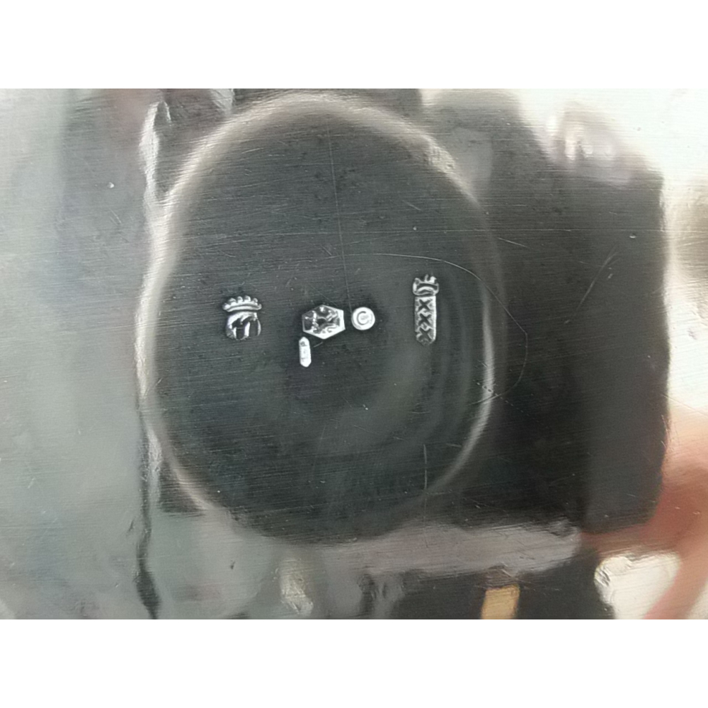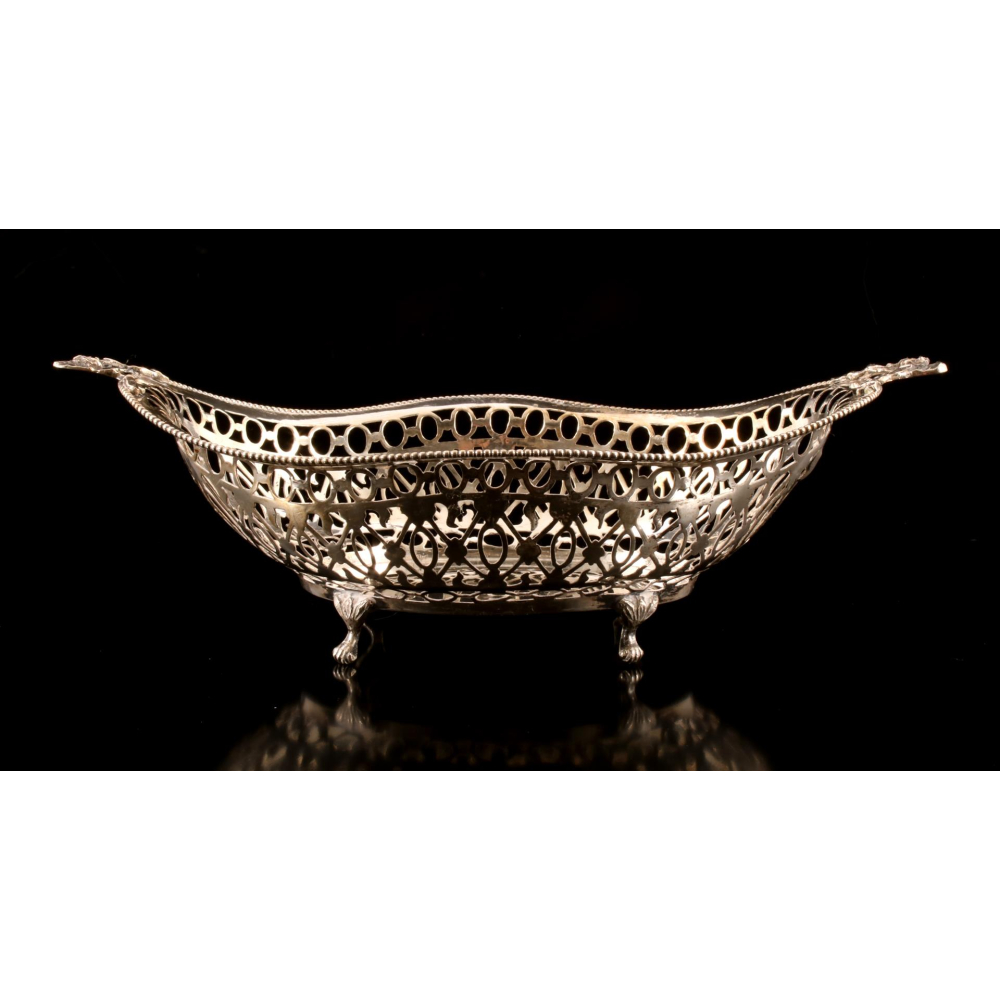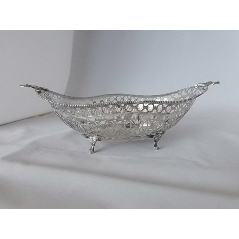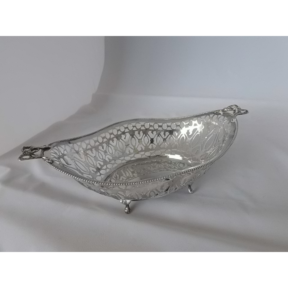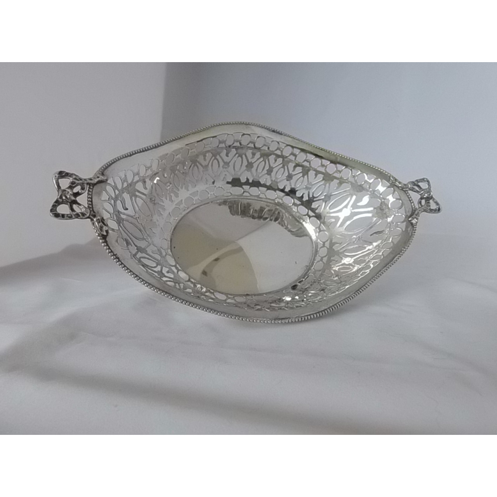 Ovale zilvereren soezenmand, J Postbus Amsterdam, jaarletter 1912, ajour gezaagd en versierd met strikken en parelrand en staand op 4 klauwpootjes.