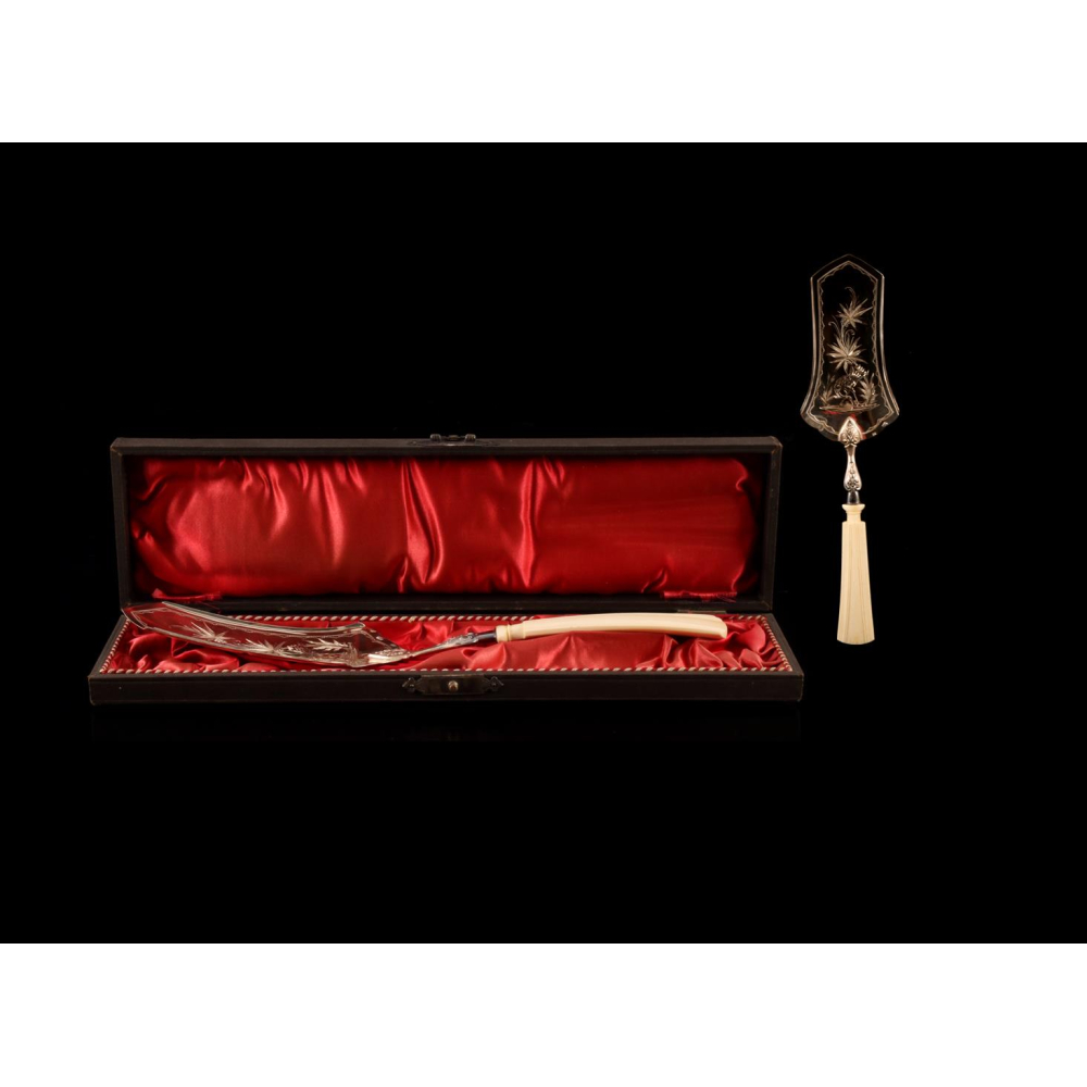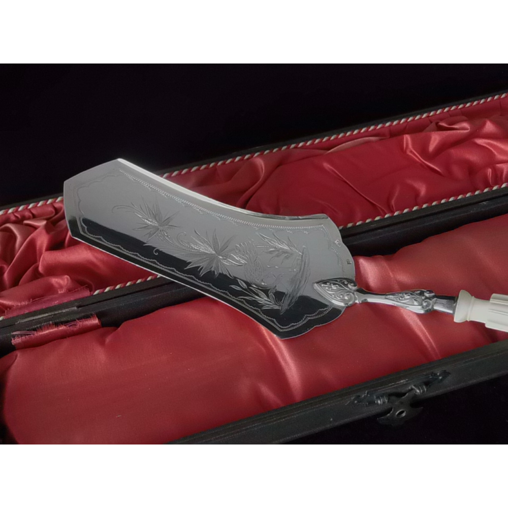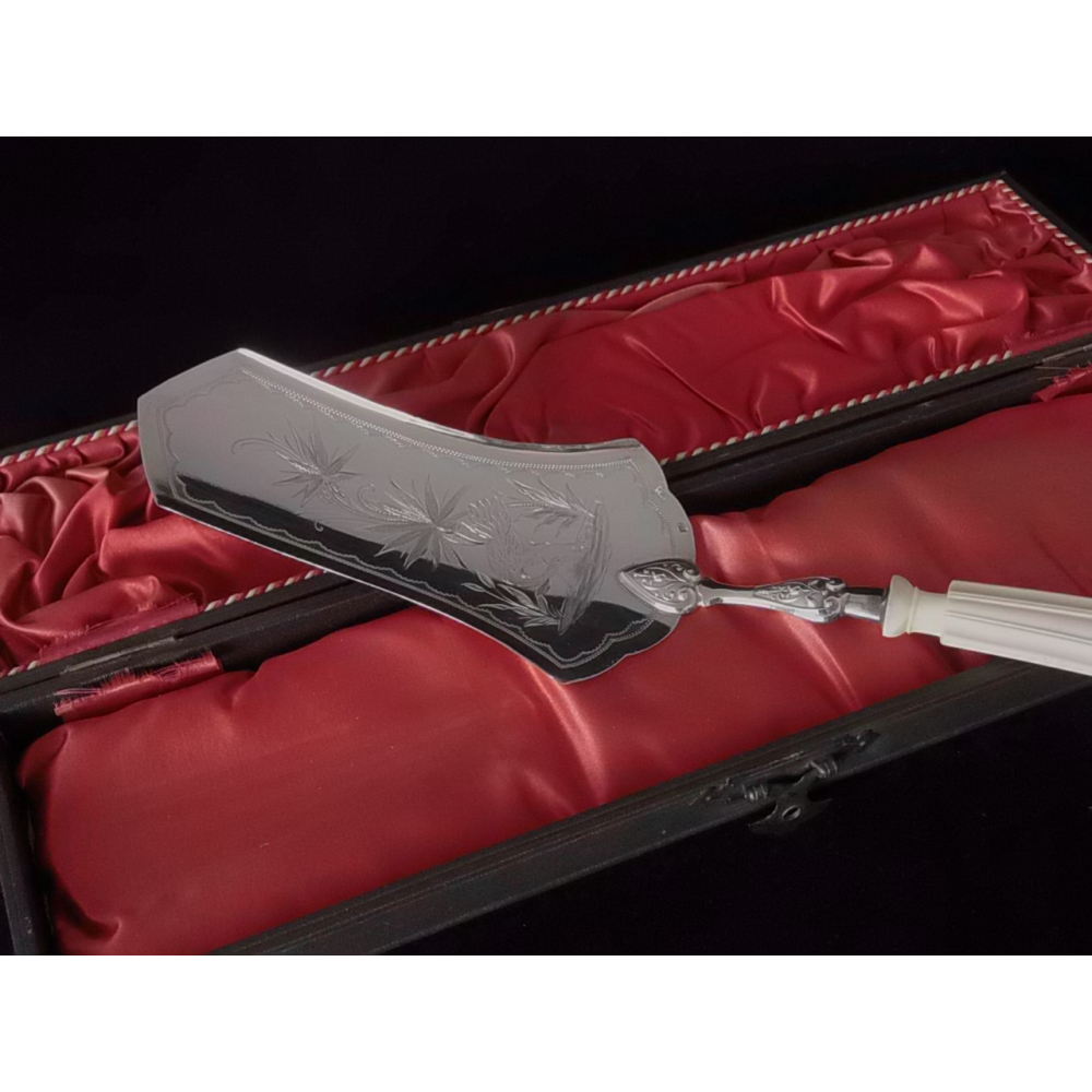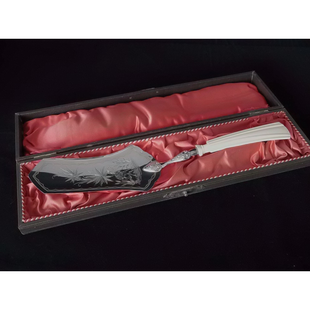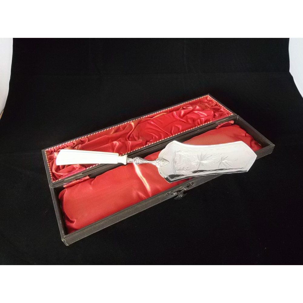 Zilveren taartschep, gemerkt 800, ca 1920, met benen heft, in cassette, 28 cm lang