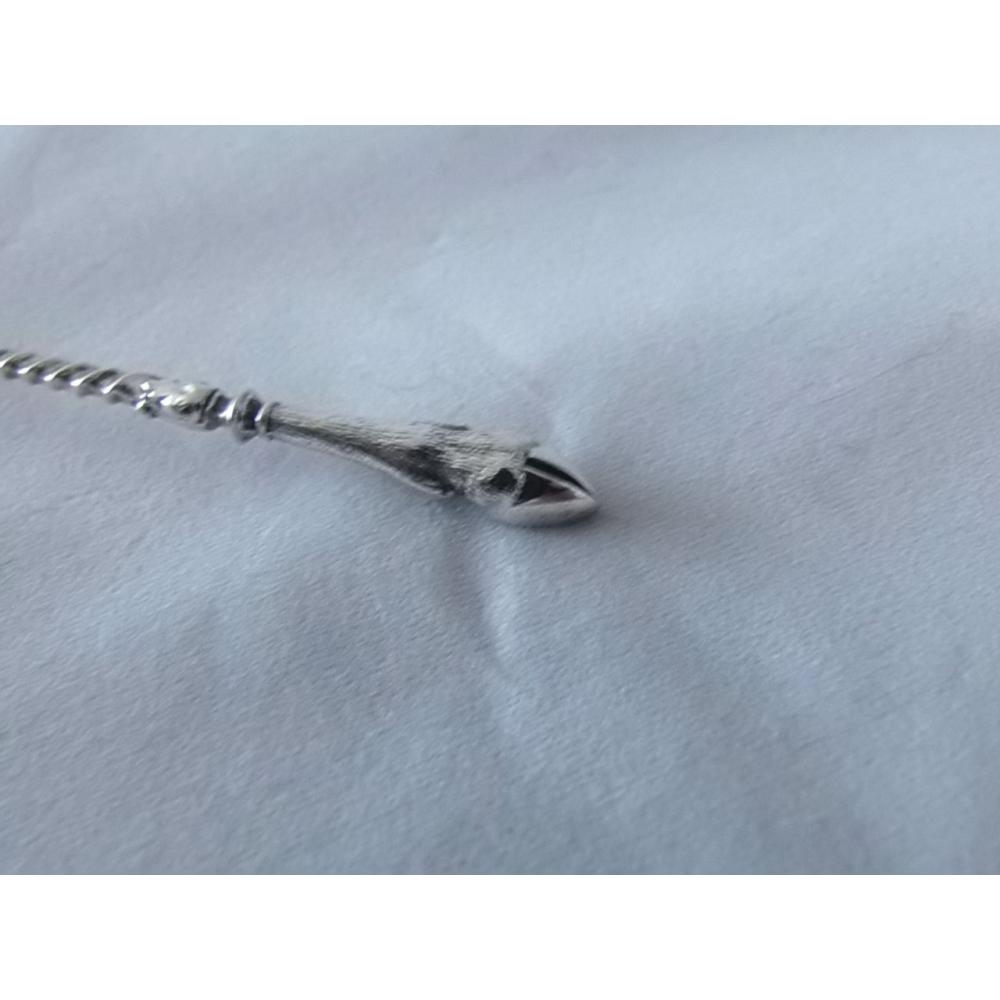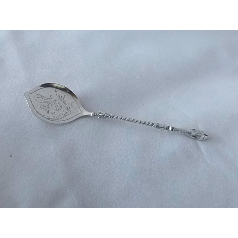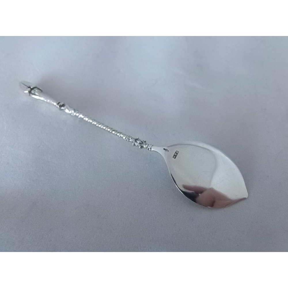 1 zilveren lepeltje, gemerkt met zwaardje en makersteken VK. Het eind is gevormd als bokkepootje.